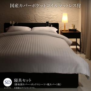 セットで決める 棚・コンセント付 本格ホテルライク収納ベッド 〔Etajure〕エタジュール 〔国産カバーポケットコイルマットレス付き〕 寝具カバー3点セット付 セミダブル 〔フレーム色〕ブラック 〔シーツ色〕ミッドナイトブルー【代引不可】【北海道・沖縄・離島配送不可】